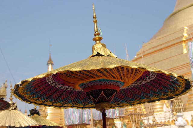 Umbrella is used for decoration and sun protection too. Novitiation ceremony at Shwedagon Paya, Yangon. Myanmar (Burma).