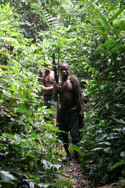 Pygmy is hunting, village down to the Lobe River. The Pygmy people are gatherers and hunters. They hunt animals such as antelopes, pigs and monkeys, and also gather honey, wild yams, berries and other plants. Cameroon.